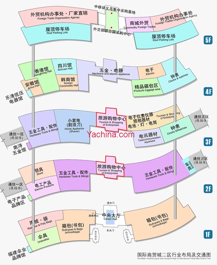 Opened on 22 October, 2004, International Trade City District 2(Section F & G) occupies 483 Mu, over 600,000 m2 building area, above 8000 booths and the business entities exceed 10,000. The first floor deals in suitcases & bags, umbrellas and raincoat; the second floor deals in hardware tools & fittings, electrical products, locks and vehicles; the third floor deals in kitchenware & sanitary ware, small home appliances,