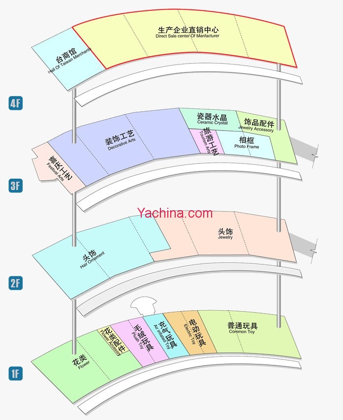 Founded in October, 2001, the International Trade City District 1 is officially put into operation on 22 October, 2002 which occupies 420 Mu and a building area of 340,000 m2 with a total investment of 700 million. It is divided into five main business areas: subject of the market, manufacturer outlet center, shopping center, warehousing center and catering center. There are more than 9000 booths and over 10500 business entities in total. The 1st floor deals in artifical flowers and toys, the 2nd floor for jewelry, arts & crafts on the 3rd floor, manufacturer outlet center on the 4th floor and sourcing center of foreign trade companies in the east subsidiary building.It divide to A,B,C,D and E sections.